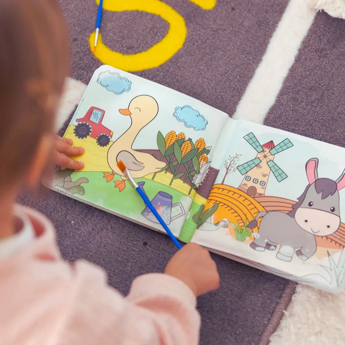 S mokrými prštekmi alebo štetcom dieťa objavuje farebné motívy, ktoré po uschnutí zmiznú a stránky sú opäť pripravené na ďalšie objavovanie!